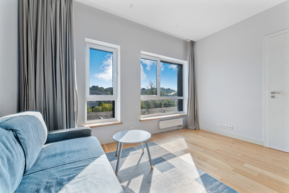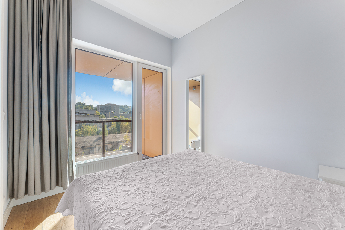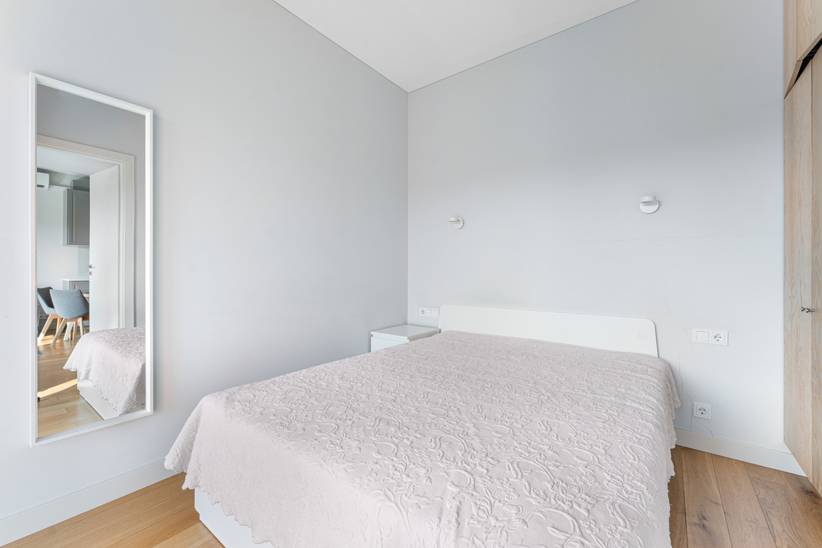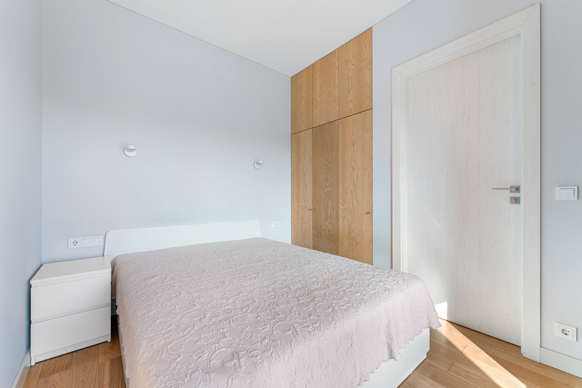 Svetainė, sujungta su virtuve, atskiras miegamasis, modernus vonios kambarys su dušu. Prabangus įrengimas: kokybiškos medinės grindys, visa būtiniausia buitinė technika, indaplovė, oro kondicionierius, skalbimo mašina, integruotos spintos, balkonas. Solidi ir saugi kaimynystė.