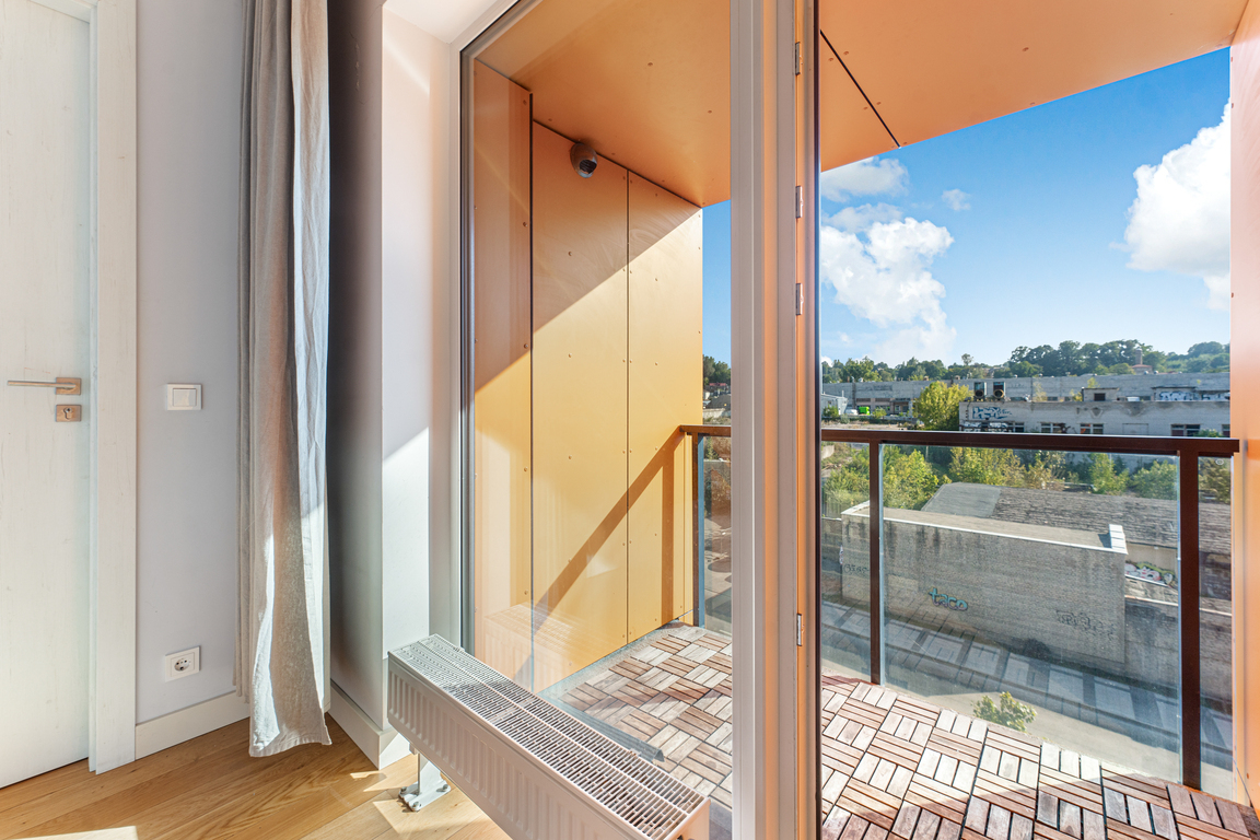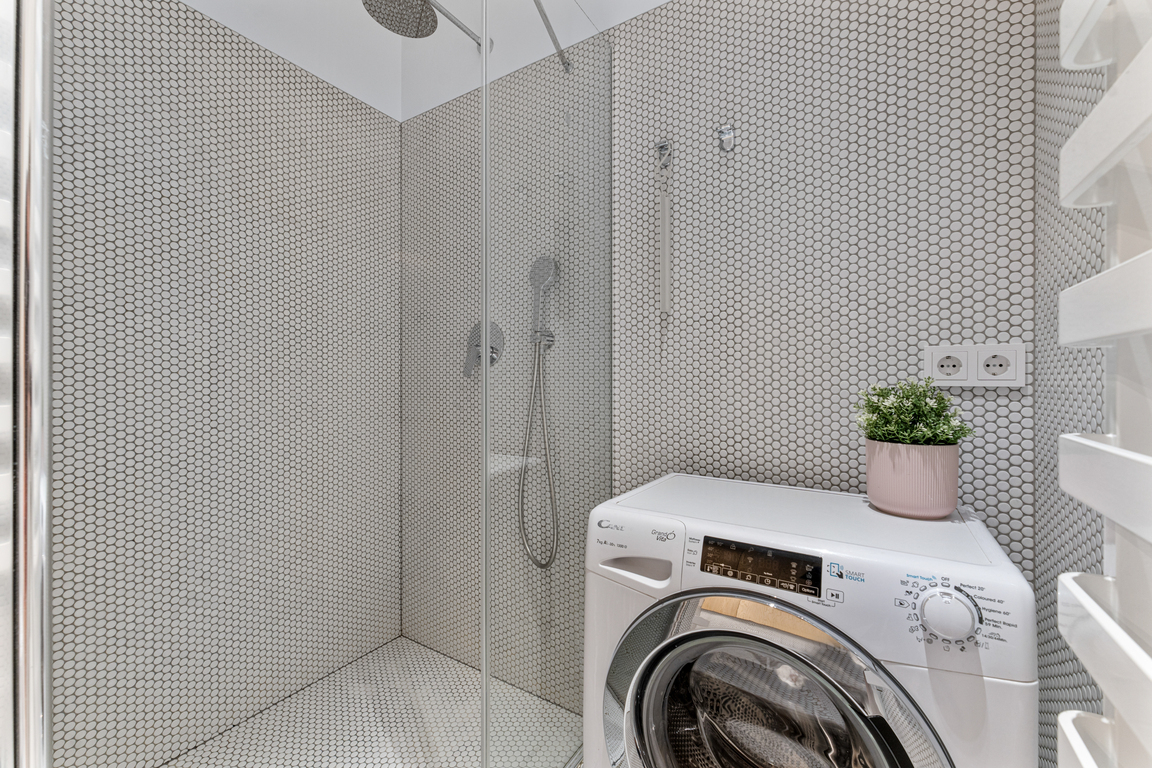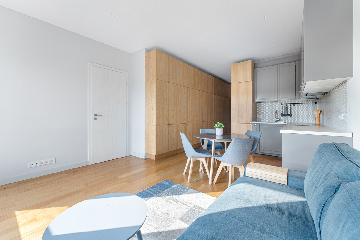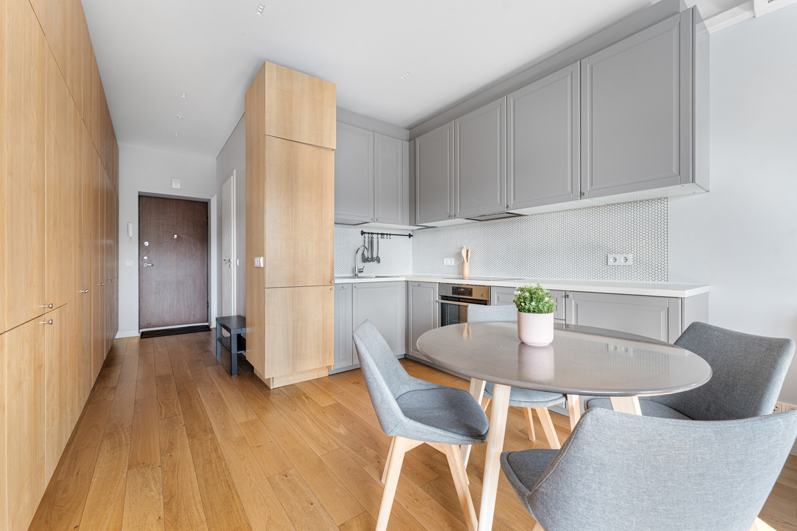 Svetainė, sujungta su virtuve, atskiras miegamasis, modernus vonios kambarys su dušu. Prabangus įrengimas: kokybiškos medinės grindys, visa būtiniausia buitinė technika, indaplovė, oro kondicionierius, skalbimo mašina, integruotos spintos, balkonas. Solidi ir saugi kaimynystė.
