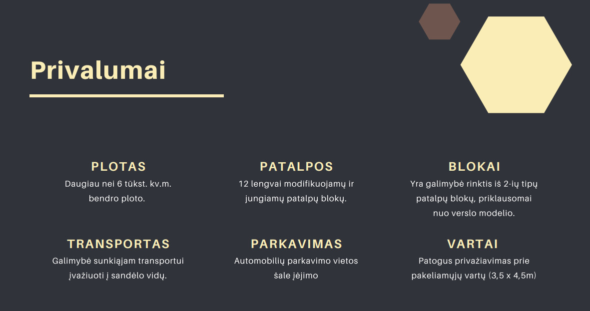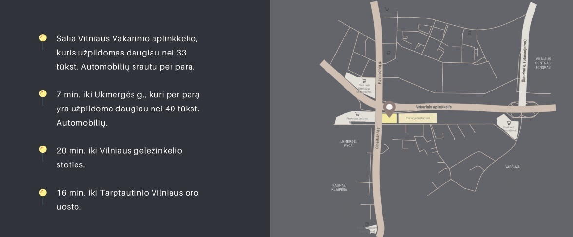 Strategiškai puiki vieta prekybinių sandėlių projektui. Projektas vystomas šalia vienos srautingiausių Vilniaus gatvių – Vakarinio aplinkkelio sankirtos su Pavilnionių gatve. Puikus matomumas, lengvas privažiavimas tiek lengvaisiais automobiliais, tiek krovininiu transportu. Visuomeninio transporto stotelė už 200 m. Greta preklybos centras Pašilaičiai, aplinkui kuriasi kitos prekybinės įmonės, vykdoma daugybe gyvenamosios statybos projektų.