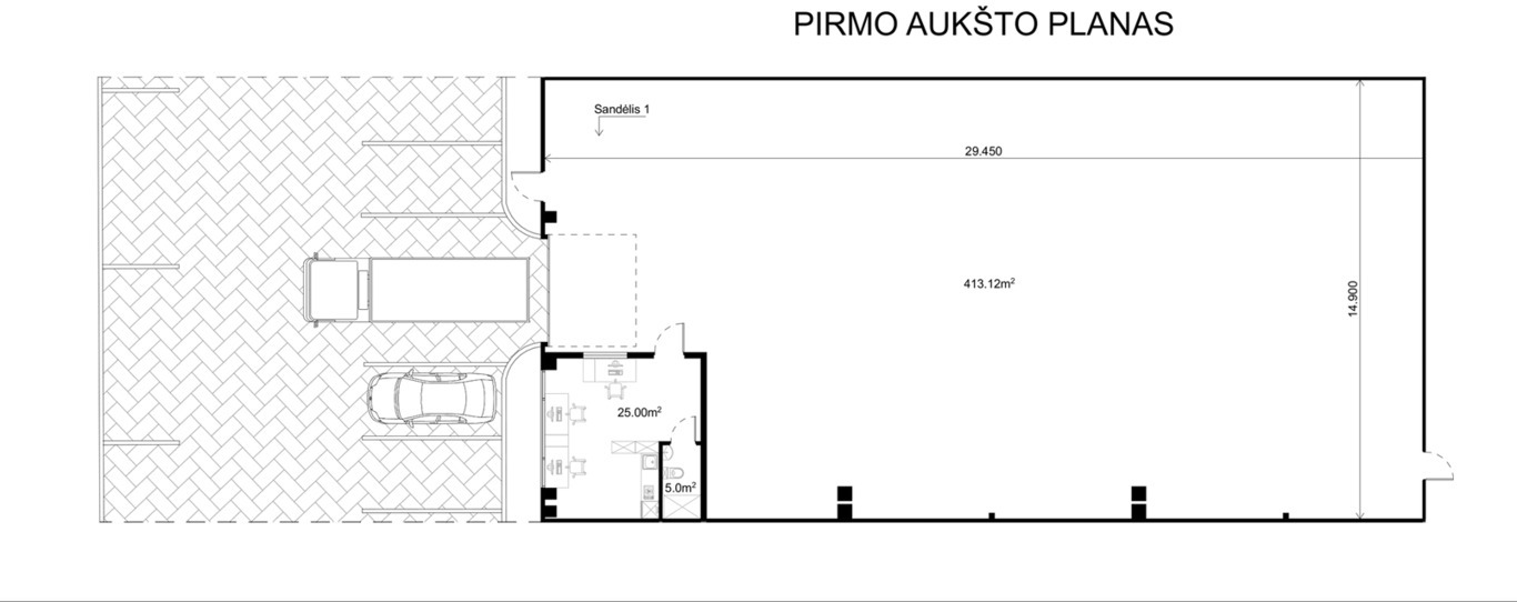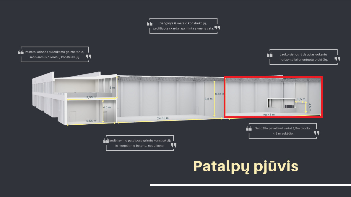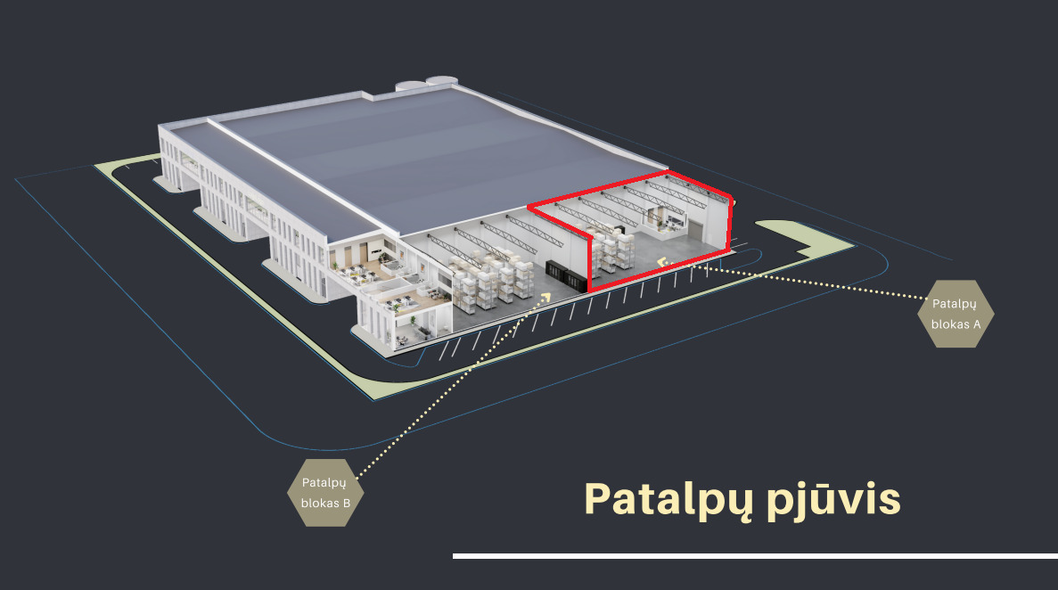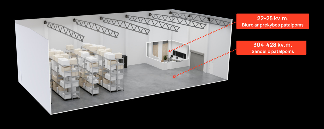 – Patalpos susideda iš: 412.35 kv. m sandėliavimo, 27.97 kv. m ofiso, bei wc;