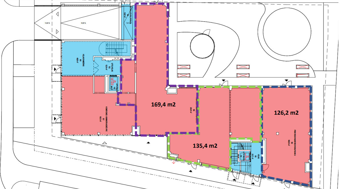 – Patalpos yra pirmame aukšte. Siūlomi plotai nuomai: 126,20 kv.m., 135,40 kv.m. ir 169,40 kv.m. Šias patalpas galima sujungti, kurių bendras plotas būtų 431 kv.m. (žr. prisegtame plane)