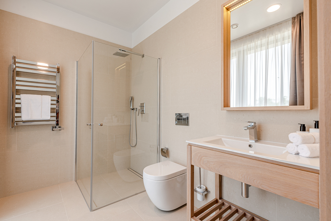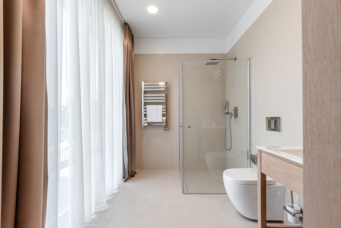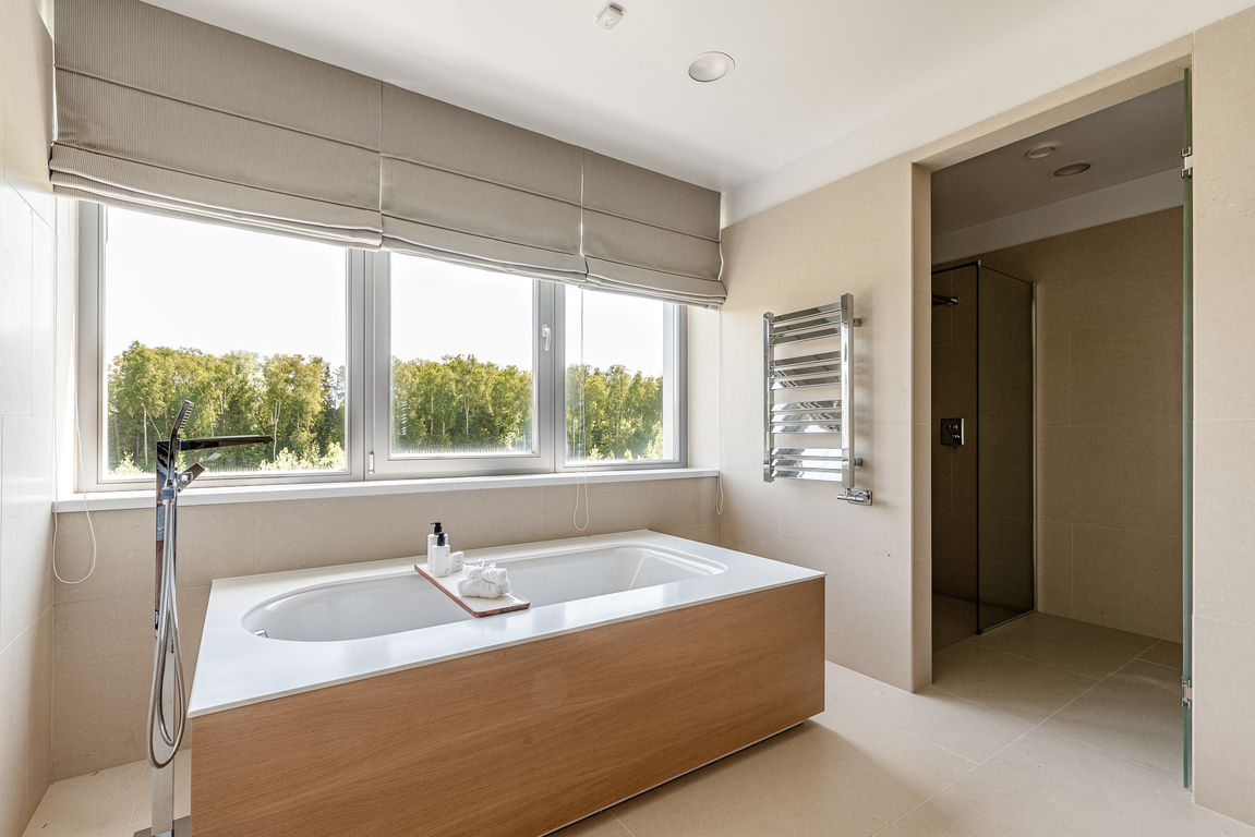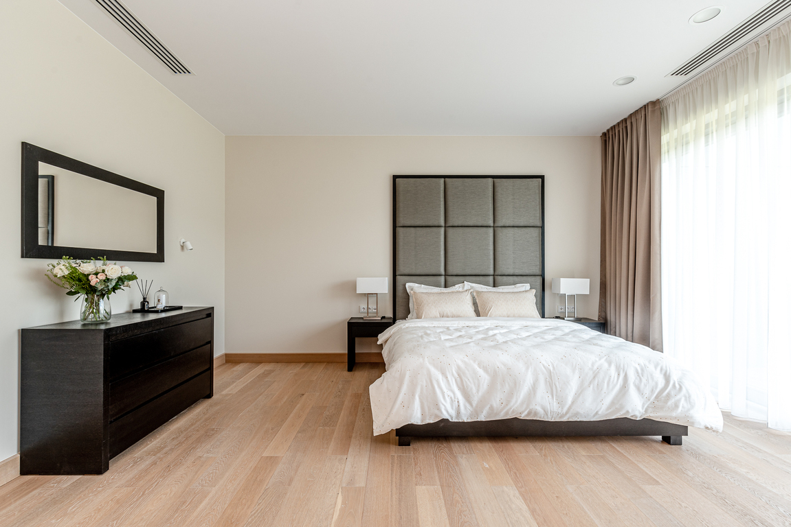 Septynetas kambarių, šešetas vonių, keletas drabužinių, terasa, terasiniai balkonai ir erdvus vonios kambarys su sūkurine vonia, kur per vitrininius langus sklinda švelniai saldus augalų ir gėlių kvapas.