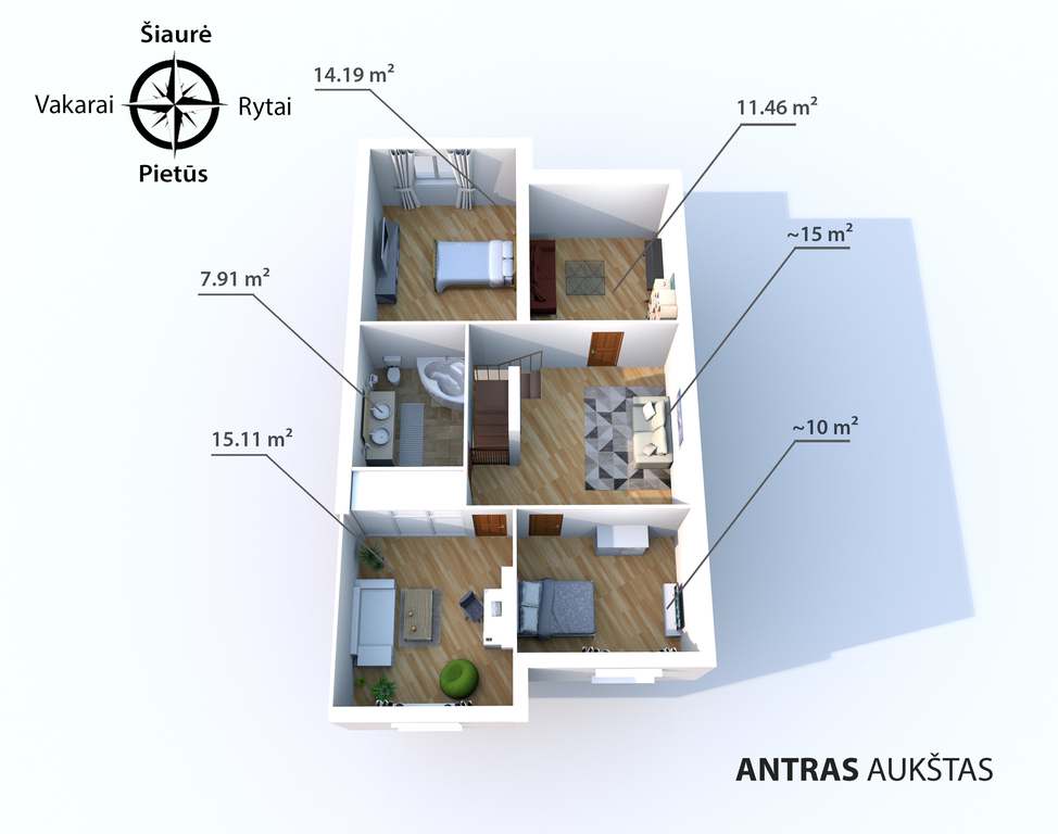 • Miegamųjų kambarių skaičius – 5 (1 pereinamas);