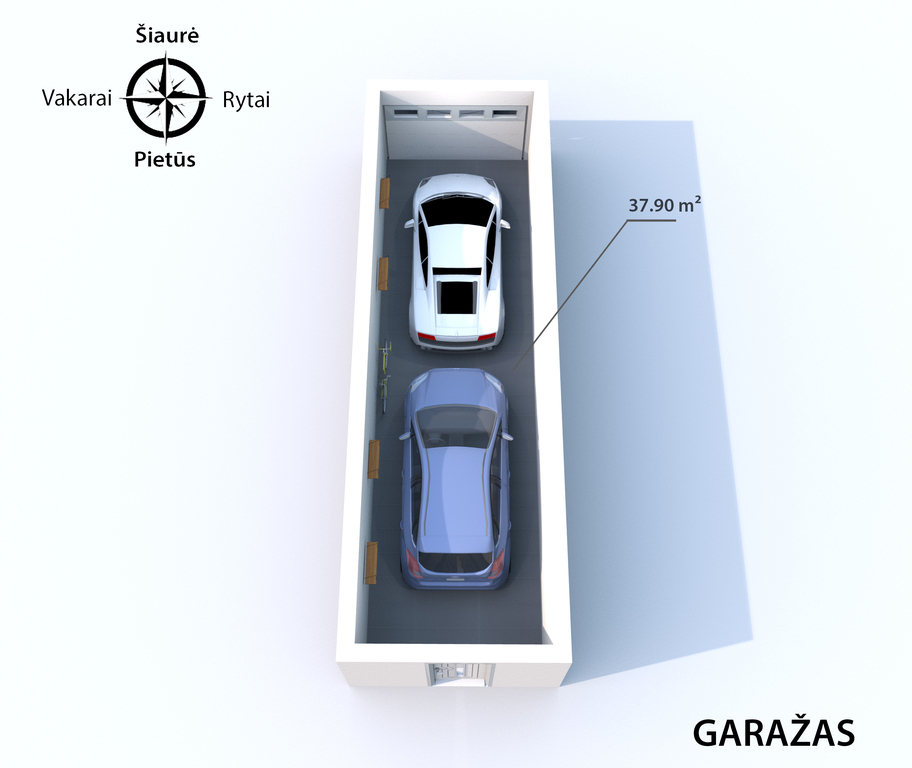 • Garažas – 37.90 m² (2 automobiliams vienas paskui kitą už papildomus 25.000 Eur);