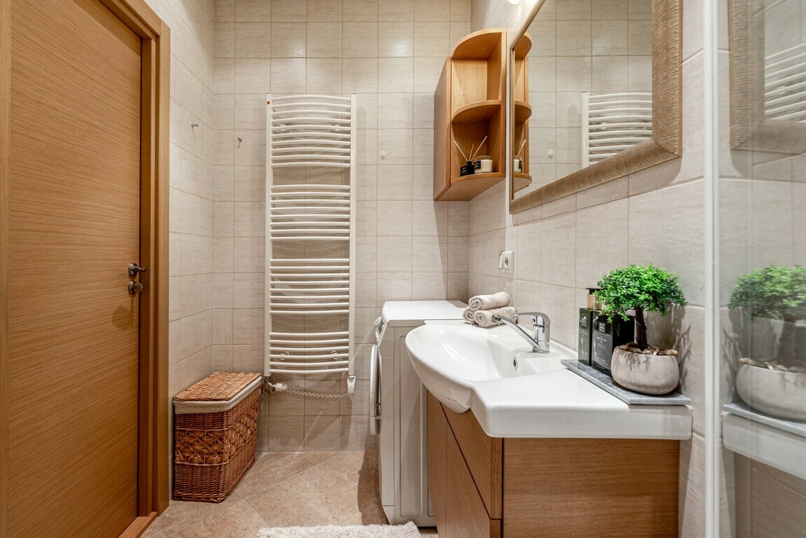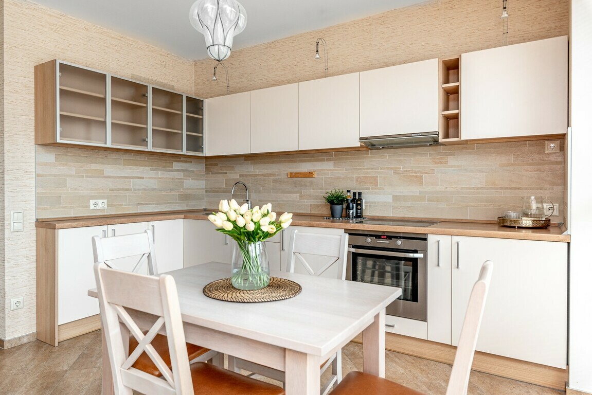 • Grindys – natūralaus balinto ąžuolo parketlentės, akmens masės plytelės;