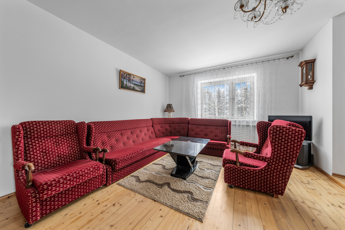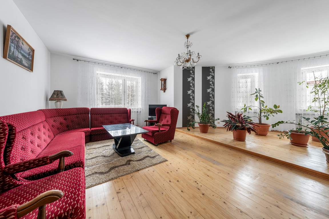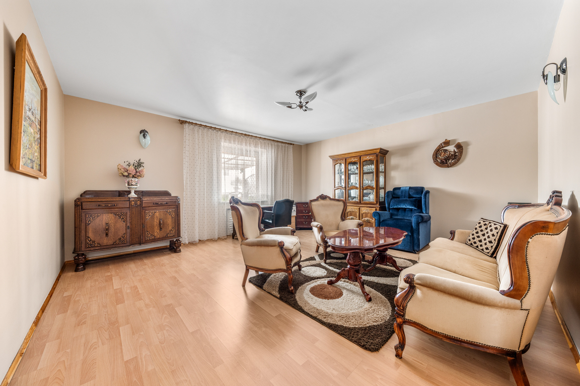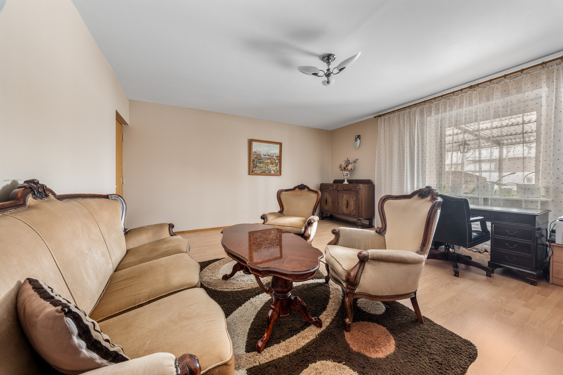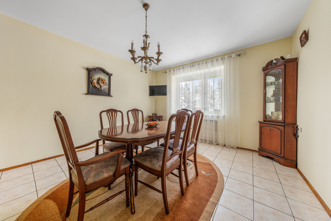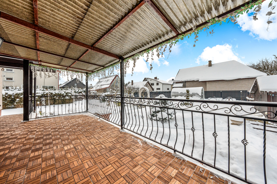 Sutvarkytas ir apželdintas sklypas, nauja tvora, trinkelėmis išklotas kiemas bei medinė terasa kuria jaukią ir prižiūrėtą namų aplinką. Namas turi šviesią ir jaukią 60 kv. m svetainė su židiniu.