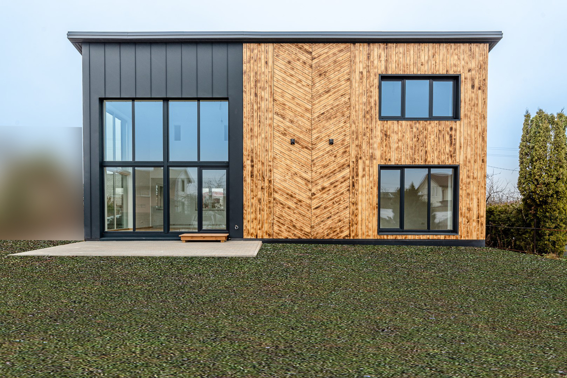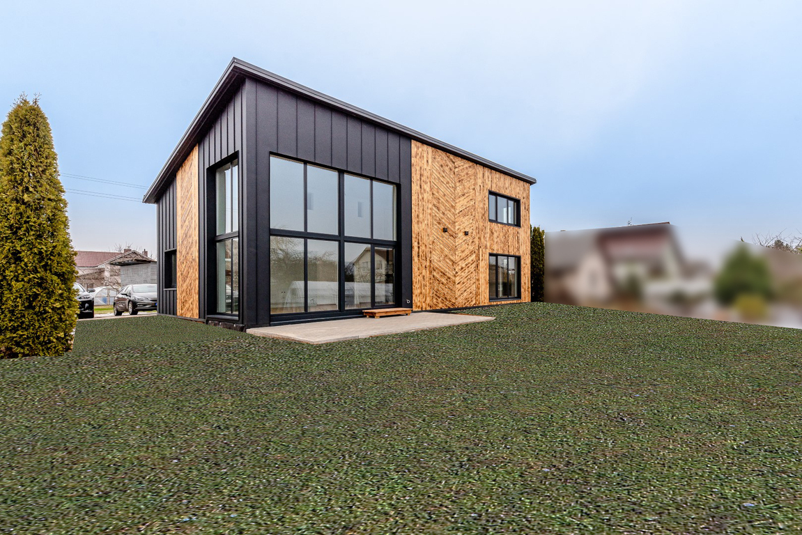 • Pastato išorės apdaila – degintos eglės, cinkuoto metalo ventliuojamas fasadas su apšiltinimo sluoksniu (15 cm PIR daugiasluoksnė plokštė);