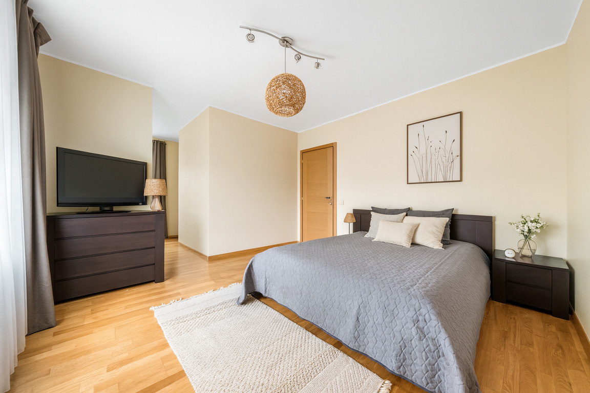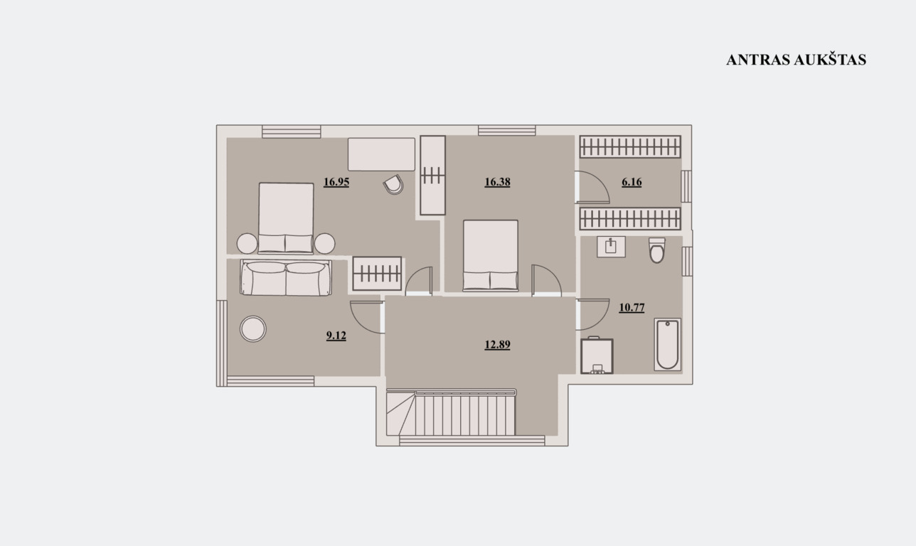 Antrajame aukšte įrengti du erdvūs miegamieji su didelėmis lovomis ir talpi drabužinė. Trečiasis kambarys šiuo metu pritaikytas kaip svečių ar vaiko kambarys, kuriame stovi sofa, tačiau prireikus jį nesunkiai galima paversti dar vienu miegamuoju. Šiame aukšte taip pat įrengtas erdvus vonios kambarys su vonia ir dušu.