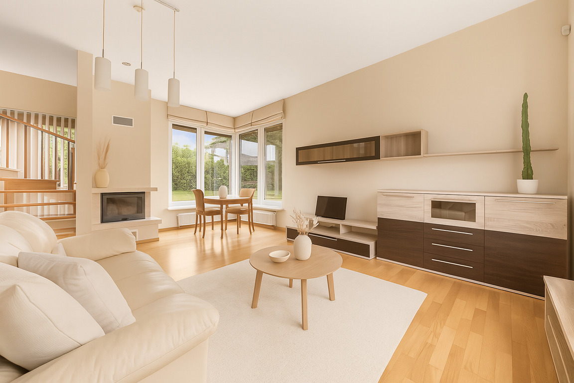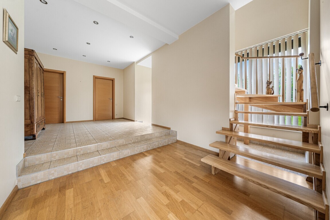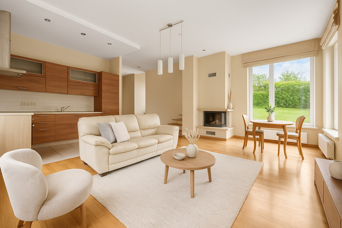 Pirmajame aukšte yra šviesi ir jauki svetainė, kurioje maloniai leisite laiką su šeima ar draugais. Pro didelius langus atsiveria vaizdas į žaliuojantį kiemą, o vakarais jaukumo suteikia židinys.