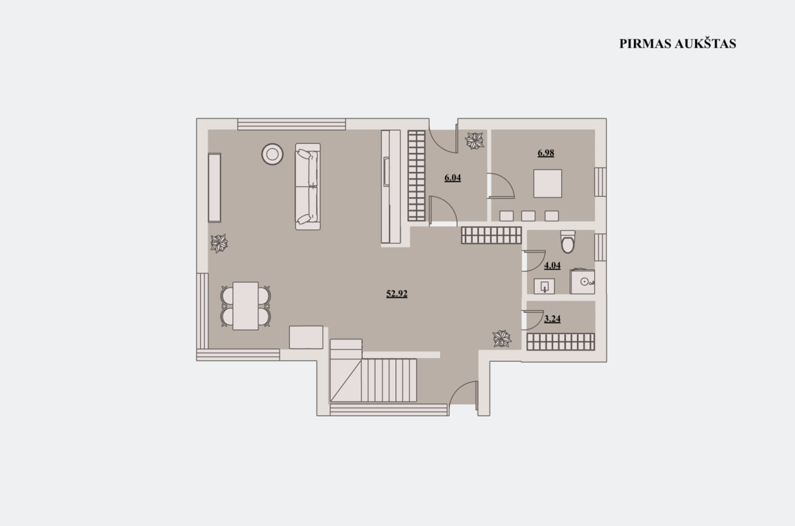 • Name suprojektuoti trys miegamieji kambariai, drabužinė, svetainė ir du vonios/dušo kambariai;