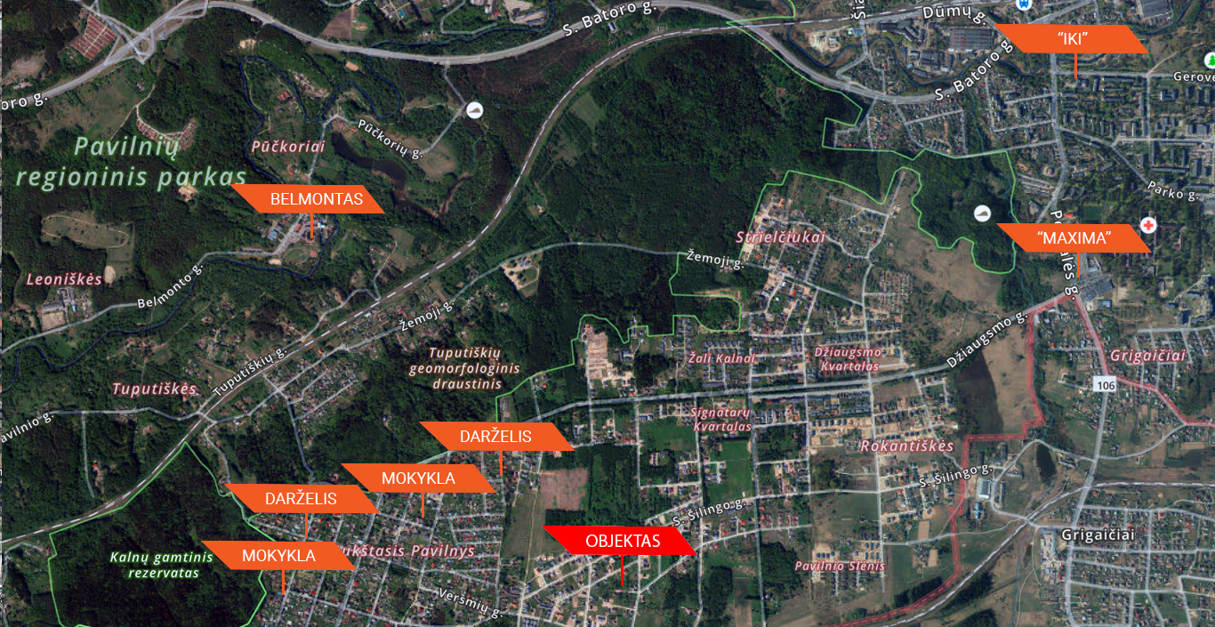 • Mokyklų – Pavilnio progimnazija už 930 metrų, Pavilnio pagrindinė mokykla už 1.6 km, Karalienės Mortos mokykla už 4.5 km;